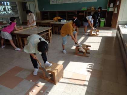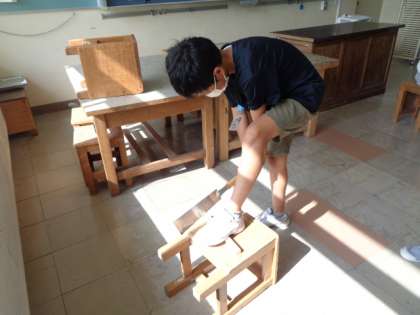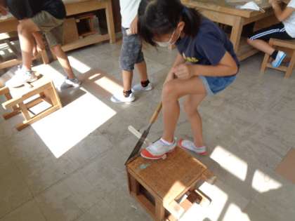 図画工作科の学習では、のこぎりを使って、木を切り、切った木を組み合わせて自分の作りたいものを作る学習をします。今日は、のこぎりを使う時の決まりをしっかり守って、木を切る学習をしました。みんな安全に気を付けて上手に木を切っていました。また、友達の様子を見て、アドバイスをする場面も見られました。今後どのような作品ができあがるのか楽しみです。