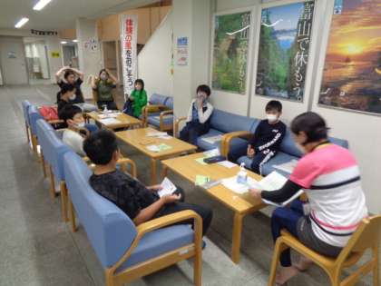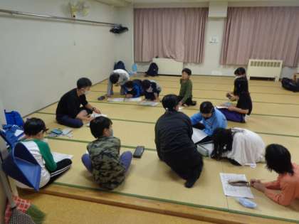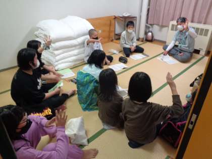 全員入浴を済ませ、係に分かれてミーティングを行っています。