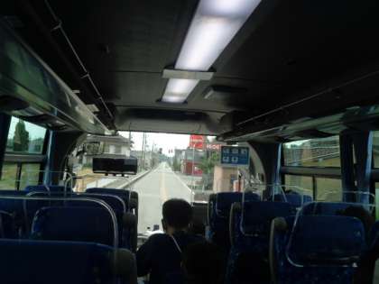 バスはアルペン村を通過しました。出発が10分遅れましたが、下校時刻は予定どおり15時35分です。