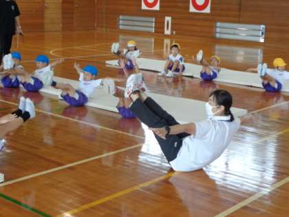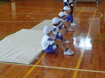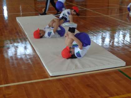 富山市のスポーツ指導員派遣事業のもと、3名の指導員の方にマット運動の基本を楽しく教えていただきました。