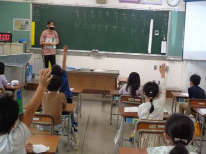漢字で表す十までの数の読み方の学習は、とても大事な学習です。なぜなら、これまで耳で聞いてきた音声での数え方と表記のズレに戸惑うことが多いからです。子供たちはそのズレも楽しんで盛んに発言を求めていました。手の挙げ方に注目です。意欲が手の形にみなぎっています。