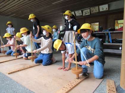 縄文時代の人々の暮らしの様子についてのお話を聞いたり、火起こし体験をしたりしました。さまざまな体験を通して、子供たちは縄文広場の紹介したいじまんを考えていました。