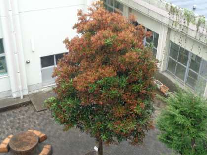 中庭にひときわ高くそびえて岡童を見守ってくれているサンゴ樹が、木のてっぺんから真っ赤に染まっています。