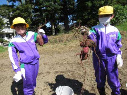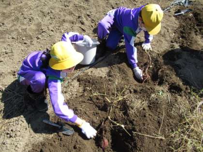 きれいな「あおぞら」の下、さつまいもほりをしました。それぞれの学年の学習発表会練習の合間をぬって、2人がそろった4時間目に行いました。大きなさつまいもが4つほどとれました。あまいサツマイモを調理して食べるのが楽しみです。