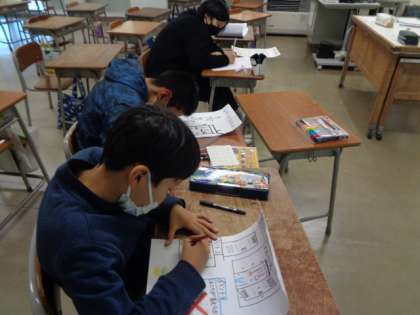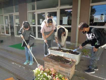 チューリップの球根植えと、清掃道具の後片付けに関するポスター制作に分担して仕事に取り組んでいました。