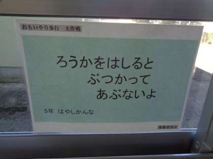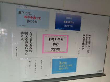 募集した標語を1枚のポスターにして、校内の至るところ(ついうっかり走りそうなところ)に掲示されています。
