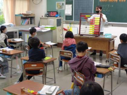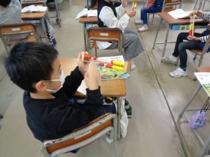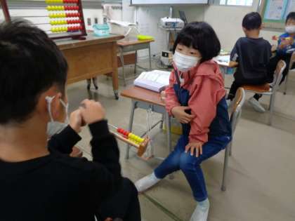 切り下がりのある引き算の計算の仕方を、20玉そろばんを操作しつつ、手順を唱えながら友達に説明しています。頭と体に計算のアルゴリズムが刻み込まれています。