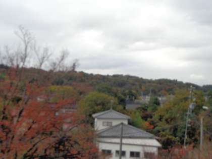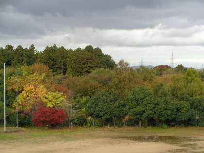 校舎3階から見た、呉羽丘陵と緑地公園の紅葉の様子です。雨に洗われて光ったりハラハラと落葉したりするさまが美しいです。この直前までは虹も出ていて幻想的な光景でした。