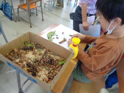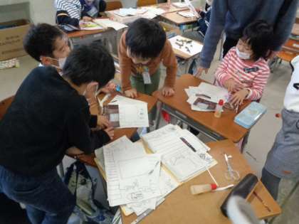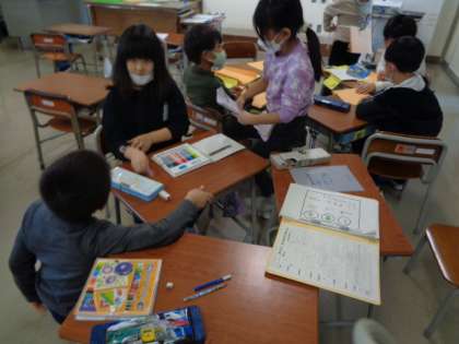 学級活動の時間を使って、係の仕事の打ち合わせです。「学級のために役に立つ仕事」を考えているのに、何より本人達が楽しそうです。中には生活科の学習など、学んだことを発展させて楽しい活動を考えている係もあります。