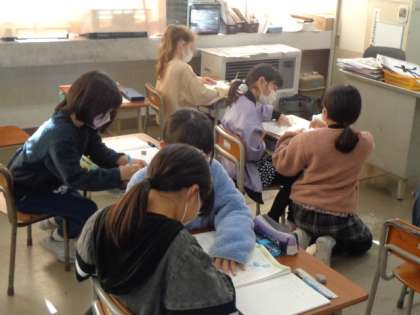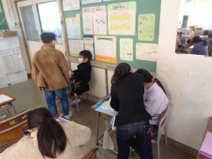 先生の指示のもと、課題を早く終えた子がさっと教室に広がって、あちこちで学び合いが起こっています。