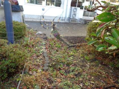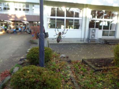 朝、子供たちを出迎えていると、大きな女郎蜘蛛が一生懸命に巣を張っていました。