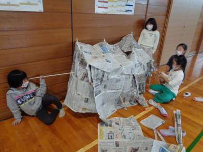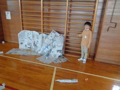 体育館いっぱいに広がって、新聞紙を材料にした造形遊びを楽しみました。新聞紙の特性をうまく捉えて、どんどん造形を発展させていました。