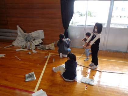 体育館いっぱいに広がって、新聞紙を材料にした造形遊びを楽しみました。新聞紙の特性をうまく捉えて、どんどん造形を発展させていました。