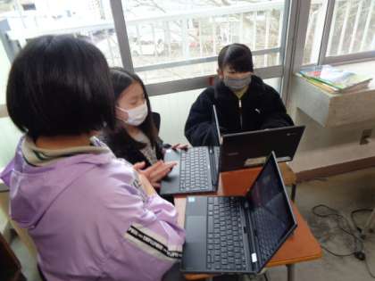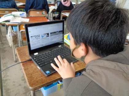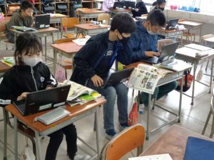 図書室の資料に当たる子、ネット上の情報を検索する子、資料の特徴を生かして作業しています。