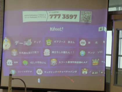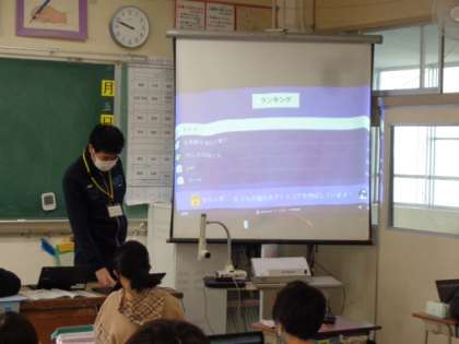 英語専科教諭の坪坂先生作成のクイズ教材を使って楽しく学んでいます。