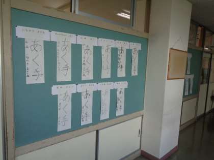 と、いうことで2年生教室の廊下にも書き初め練習作品が展示されました。