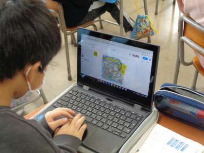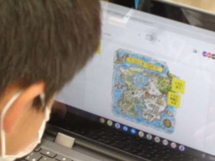 まずはたから島の地図を見て、「どんなできごと(事件)が起きそうか」、アイディアを地図に書き込んでいる様子です。