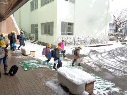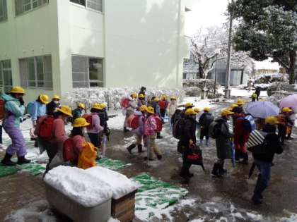 気温が低いので、体育館に一旦集合し、地区ごとに一斉に下校しました。