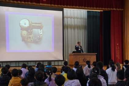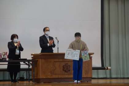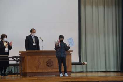 始業式後は、授賞伝達を行いました。芸術・スポーツの分野での成果を全校児童に伝達しました。