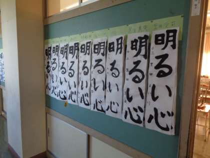 朝。各教室の前には、昨日の書き初め作品が展示されています。