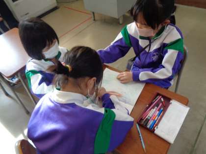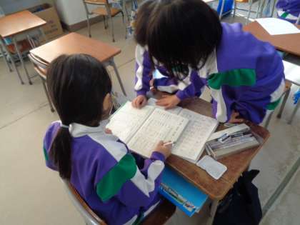 1年生は練習問題と教科書を照らし合わせ、どの漢字が出題されているか調べていました。