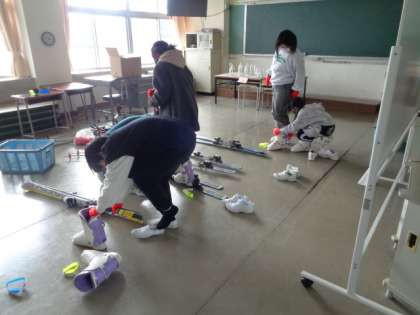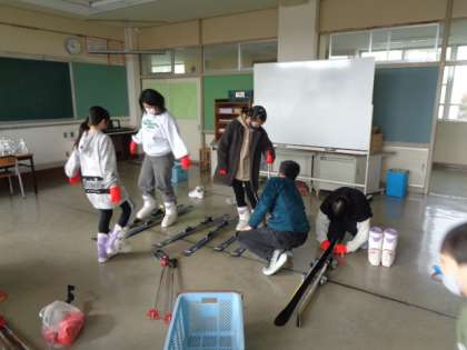 初めてスキーを履く子のために、事前に5セットレンタル業者様に借り受けて、体験学習をしました。