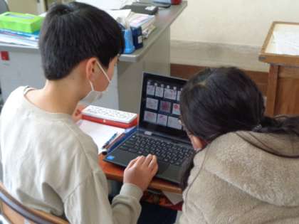 表紙を作る子、挿絵にふさわしい図案を探す子・・・。