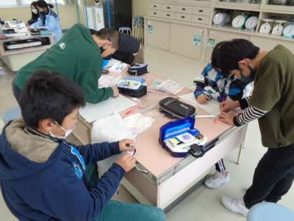 教え合いながら、慎重にまち針を打ったり、タブの縫い付け位置を決めています。