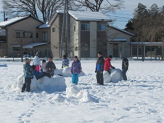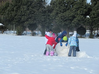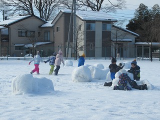 1年生に先んじて、新雪のグラウンドで2年生も雪遊びに取り組みました。