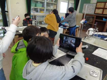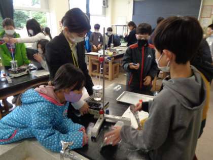 ・実験器具を使い実験を進める子
