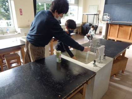 1枚目。6年生が下級生に実験台の水場の汚れの落とし方を丁寧にレクチャーしています。6年生はあと一ヶ月で卒業です。以前自分が担当していた掃除を引き継いでいるかのような場面です。汚れをきれいに落とすための手順は下級生には難しそうでしたが、下級生も6年生の指導にしっかり応えようとしています。