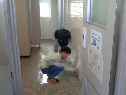 2枚目。トイレの壁のタイルをペアで掃除しています。二人とも目地の汚れまで磨き落とそうとしていて、そこには年齢の上下関係はすでにありません。しかし、異年齢の相手を互いに意識して仕事に励んでいることは間違いありません。