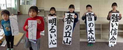 各学年の代表児童が、基本的な「とめ」「はね」「はらい」に気を付けて書き上げました。大会本番に向け、各自がそれぞれの課題に注意しながら練習を重ねます。