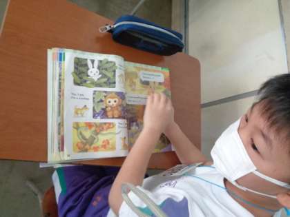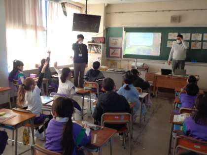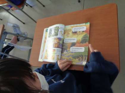 ALTの先生の英語の質問に答えるために、教科書の絵の中に隠されたたくさんの動物を見つけ出しています。“small”“long”など、やりとりに使われた言葉をつかって、休み時間にコミュニケーションを楽しむ姿が見られていました。