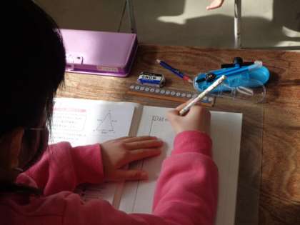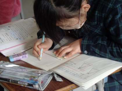 二等辺三角形を書く手順を前時で学んだ子供たちは、端的にノートにまとめて表す大切さも理解しています。だからどの子も真剣に自分の手順をノートに表しています。