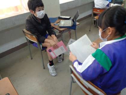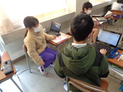 教科は分かりませんでしたが、互いの考えをある程度まとめた段階で、ペアになって説明している場面です。