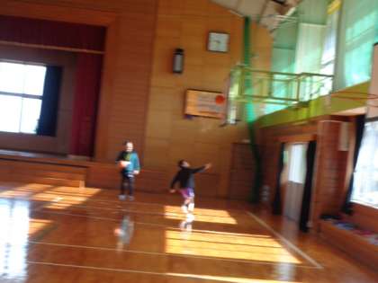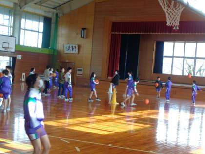 バスケットボールの学習を始めました。ゲームを楽しむためには、基礎的な技能を身に付けることが必要、ということでドリブルシュートの練習に励んでいました。