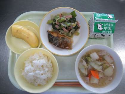 今日の献立は、ごはん、あじのみりん焼き、チンゲンサイソテー、豚汁、バナナ、牛乳でした。チンゲンサイソテーは、中華風味でチンゲンサイと玉ねぎの甘みがおいしかったです。豚汁は、たっぷりの野菜と厚揚げ、生姜の香りが程よく食べやすかったです。今日もごちそうさまでした。