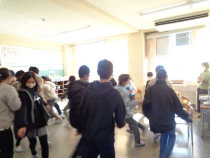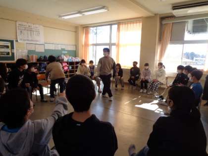 6年教室では、学級活動でゲームが行われていました。円状に椅子を並べ、フルーツバスケット風のゲームをみんなで楽しんでいました。