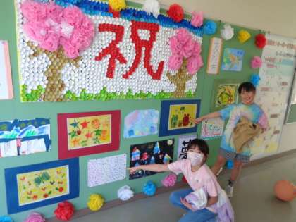 給食室前の掲示板には、5年生が制作したペットボトルキャップによる大がかりなモザイク画が掲示されています。いつも誰かが立ち止まって観賞しています。その周りには1年生から5年生の図工作品が彩りを添えています。