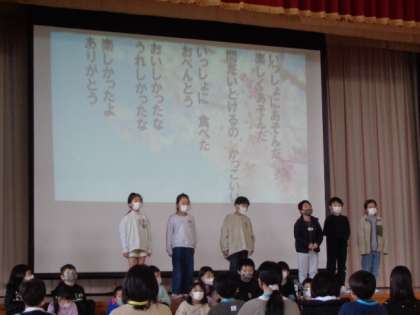 2年生は、国語科の「詩をつくろう」の学習を発展させて、班ごとに6年生との思い出を詩にまとめ音読発表しました。発表後は2年生もメッセージカードを一人一人にて渡しました。