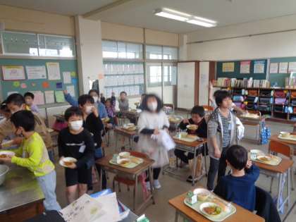 もうすぐ3年生。「協力する力を高めよう」というテーマのもと、目安として給食の準備に要した時間を測り、素早く協力して準備できるようにしています。