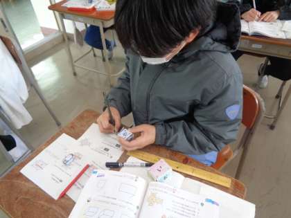 ペアで伝え合ったり、展開図を書いて実際に箱をつくって調べたりと、活動を選択して取り組んでいるようでした。