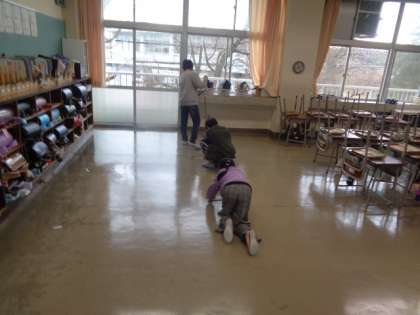 ほうき1名、雑巾2名の連係プレーです。教室を何往復もして、順にきれいにしていきます。これらの一連が黙動の中で行われていきます。「美しい!」と思います。