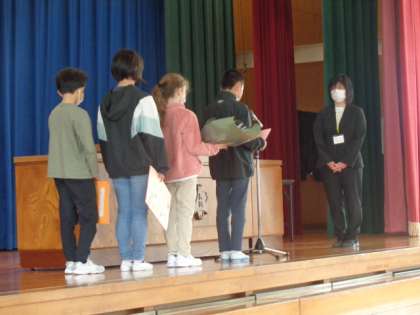授業でお世話になった3,4年生の代表児童が花束やメッセージカードともに御礼を述べました。