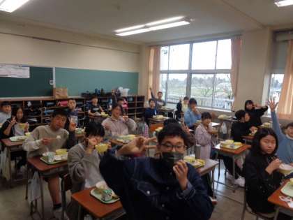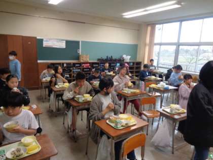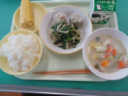 今日の献立は、ごはん、はくさいのちゅうかクリームに、チンジュワンズ、もやしとにらのソテー、牛乳、バナナでした。6年生に撮っては小学校最後の給食は中華風でした。「6年間おいしかったです!」いつものようにたくさん食べていました。