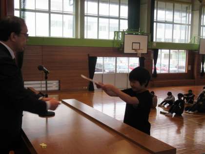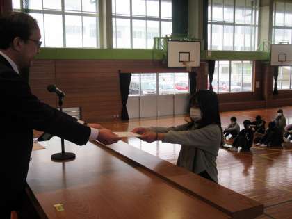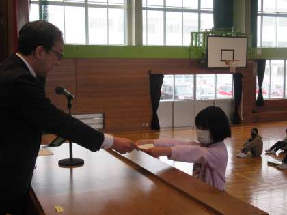 それぞれ学年の代表に皆勤賞を手渡しました。