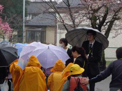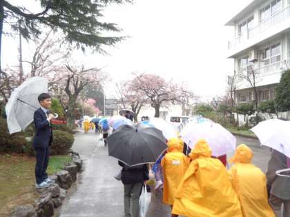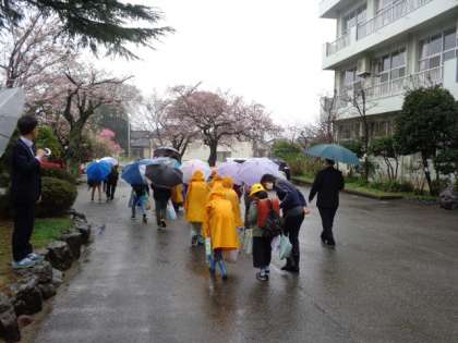 令和4年度最後の下校は、桜の花と雨の下でのシチュエーションでした。また、令和5年度に元気に会いましょう。新年度は146名でのスタートです。