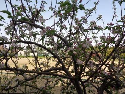 校舎東側に植えられているリンゴの花が開花しました。