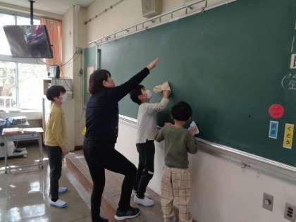 黒板のそうじの仕方について先生に教えてもらい、3人で関わり合いながら隅々まできれいにしました。